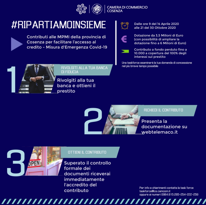 La Camera ha attivato anche uno sportello dedicato al micro-credito, che fa capo sempre alla task force, per stimolare e supervisionare l'azione del Fondo Garanzia PMI, Cassa Depositi e Prestiti e ISMEA a supporto delle imprese cosentine.